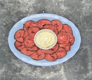 Grass fed beef brisket marinated in mustard & rosemary. Slow cooked & sliced with horseradish mayo